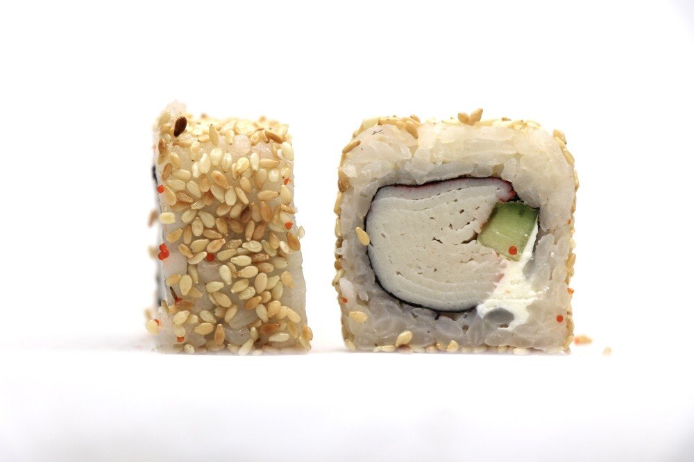 Лист нори, рис, сыр филадельфия, огурцы, краб, кунжут