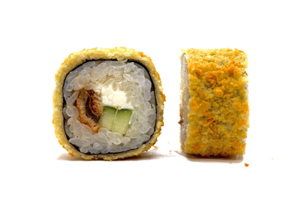 Лист нори, рис, сыр филадельфия, огурцы, угорь, соус унаги, кунжут