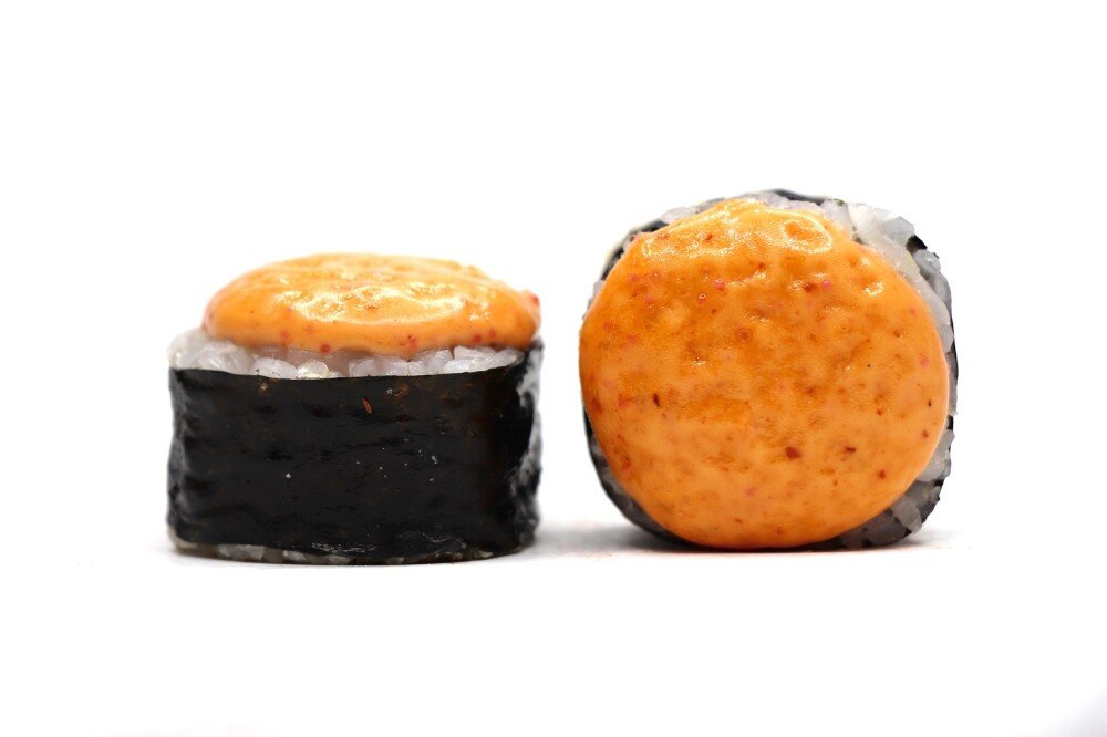 Лист нори, рис, сыр филадельфия, креветки, розовый соус, соус унаги, кунжут