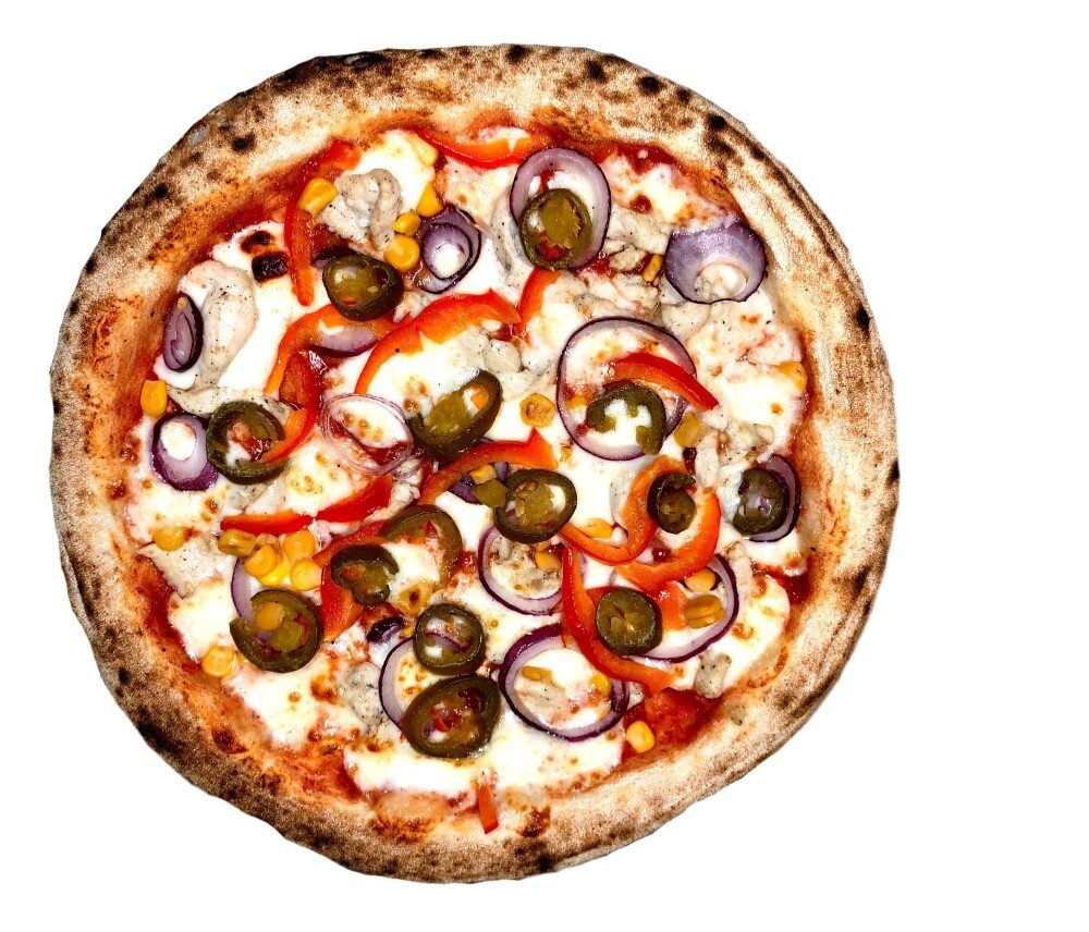 красный соус, сыр моцарелла, филе курицы, красный лук, болгарский перец, кукуруза, халапеньо