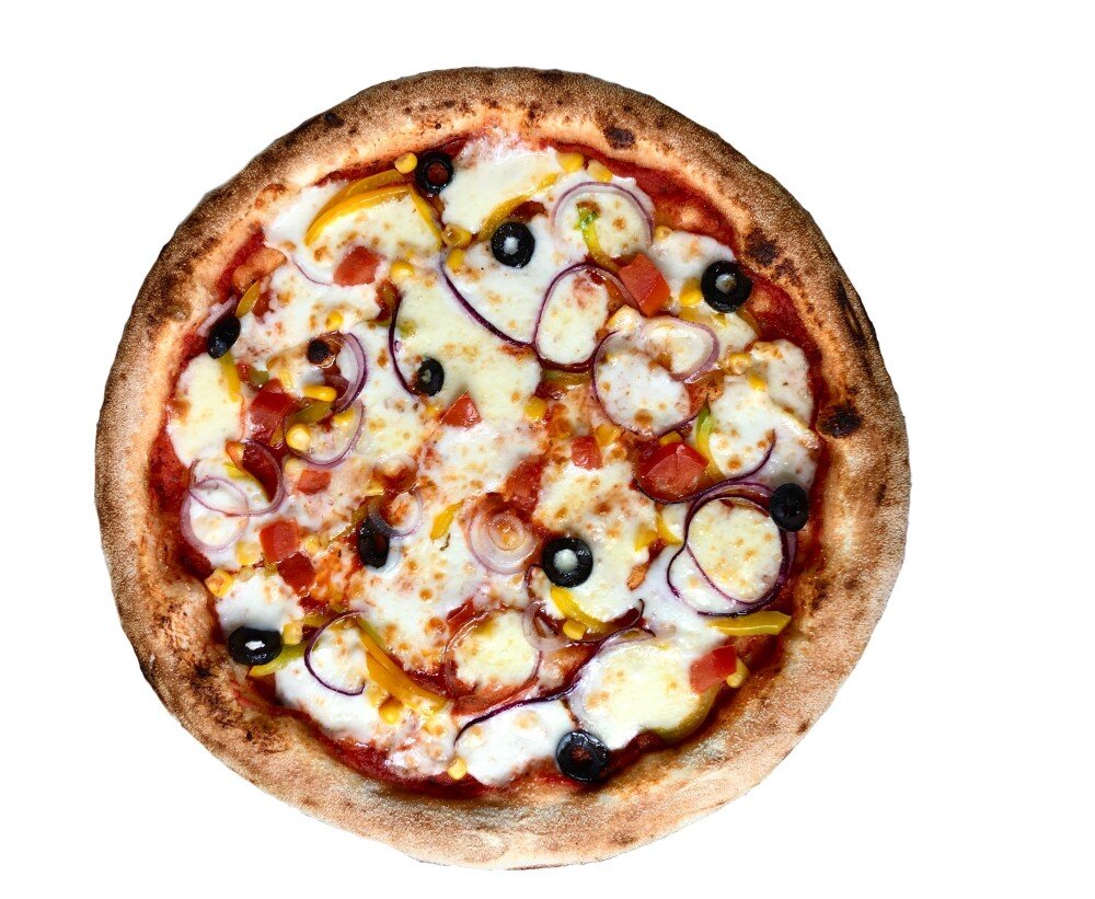 Красный соус, сыр моцарелла, помидоры, болгарский перец, красный лук, маслины, кукуруза